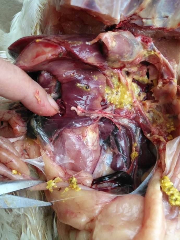 2、胸、腹氣囊混濁、增厚、內有大量混濁的滲出液,嚴重者有黃色或黃白色塊狀干酪樣物附著。